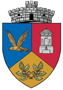Scutul este trimbrat de o coroană murală de argint cu un turn crenelat.