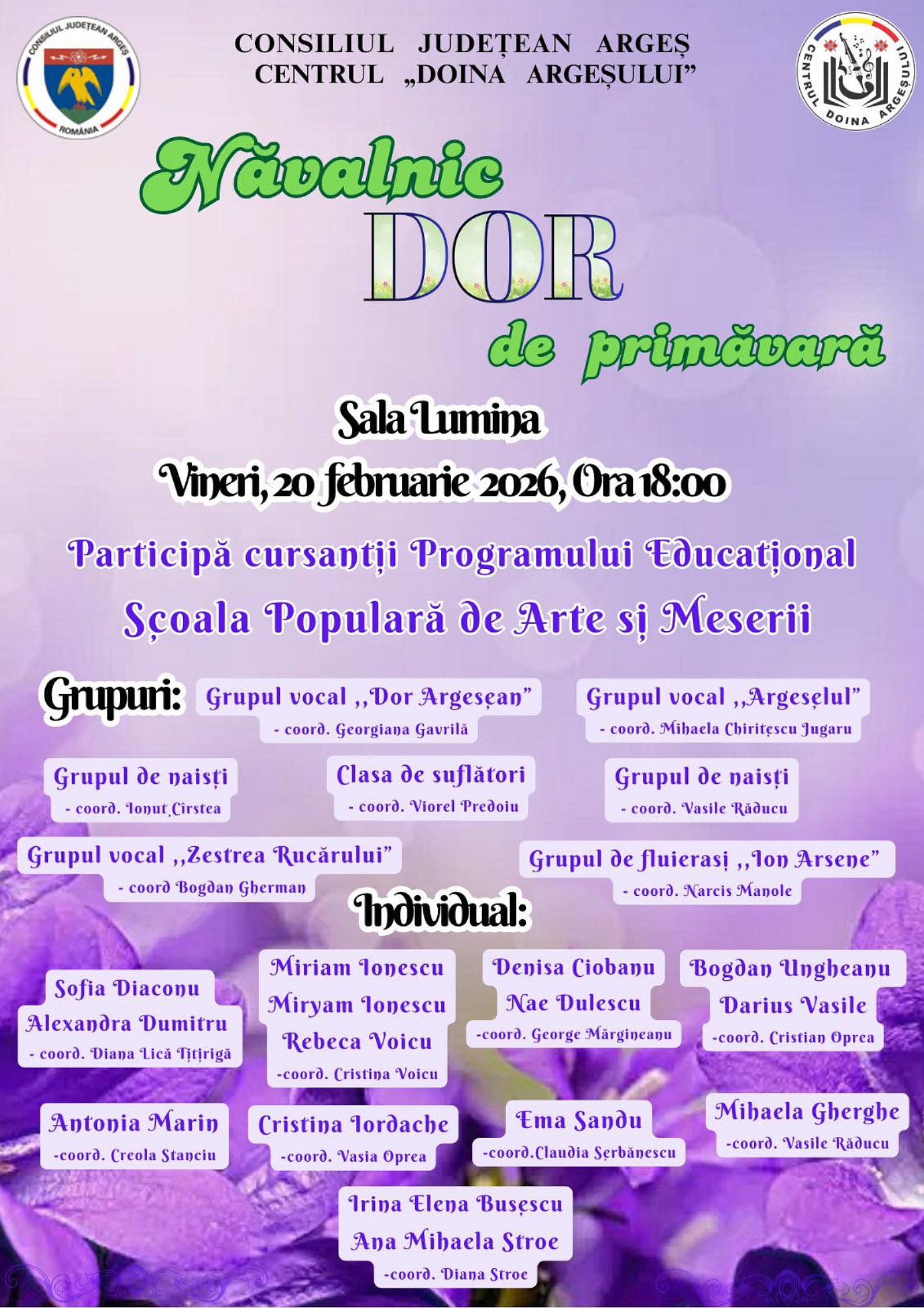 Pe 20 februarie 2026, începând cu ora 18:00, la Sala Lumina, vă așteaptă un spectacol plin de emoție, muzică și culoare: „Năvalnic dor de primăvară"