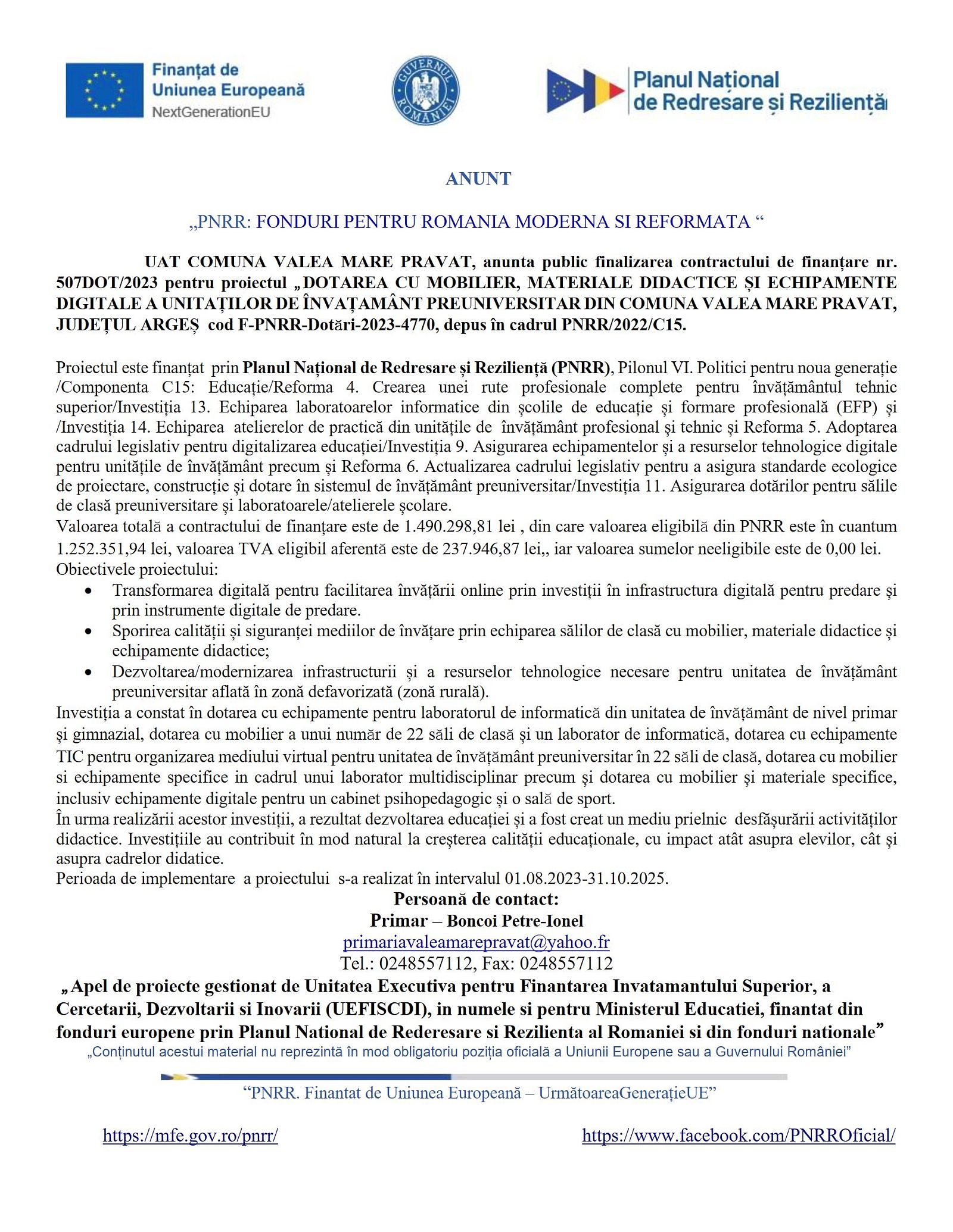 Anunturi Materiale informative referitoare la masurile de mediu si de clima Cereri - oferte vanzare teren extravilan Notificari preemptori Comunicari + Renuntari oferte de vanzare teren Procese - Verbale Strategia de Dezvoltare Locala a Comunei Valea Mare Pravat Informari Date deschise Studiu de oportunitate pentru fundamentarea si stabilirea solutiilor optime de delegare a gestiunii serviciilor de apa si apa uzata in comuna Valea Mare Pravat Comunicate de presa Accesibilitate Informatii financiare Informatii de interes public Planul anual de actiune privind serviciile sociale administrate si finantate din bugetul consiliului local al comunei Valea Mare - Pravat Alegeri Planul local de masuri pentru gestionarea deseurilor municipale la nivelul comunei Valea - Mare Pravat, judetul Arges Planul de analiza si acoperire a riscurilor (P.A.A.R.) al comunei Valea Mare Pravat Rețeaua școlară pentru grădininițile și școlile de pe raza comunei Valea - Mare Pravăț, județul Argeș