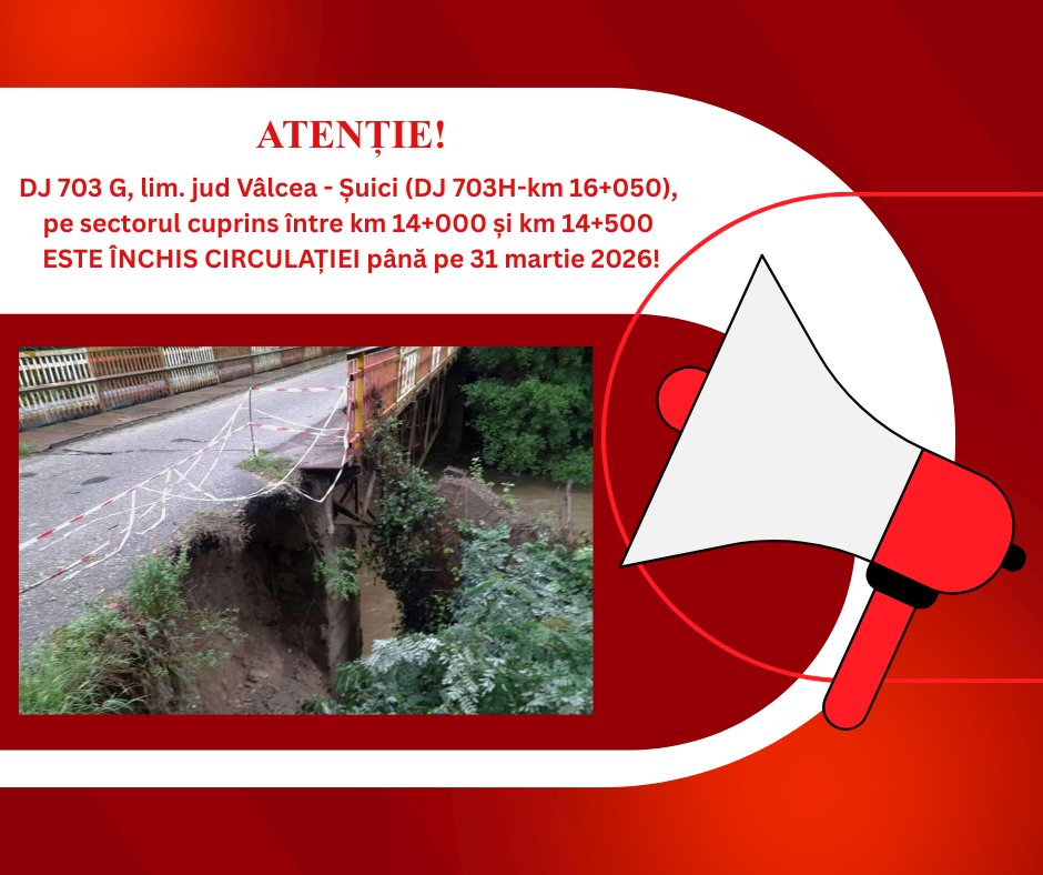 Regia Autonomă Județeană de Drumuri Argeș R.A., în calitate de administrator al drumurilor județene, reamintește participanților la trafic că circulația rămâne închisă pe drumul județean DJ 703G, lim. jud Vâlcea - Șuici (DJ 703H-km 16+050), km 14+000-19+965, pe sectorul cuprins între km 14+000 și km 14+500, L= 500 m, până la data de 31 martie 2026.